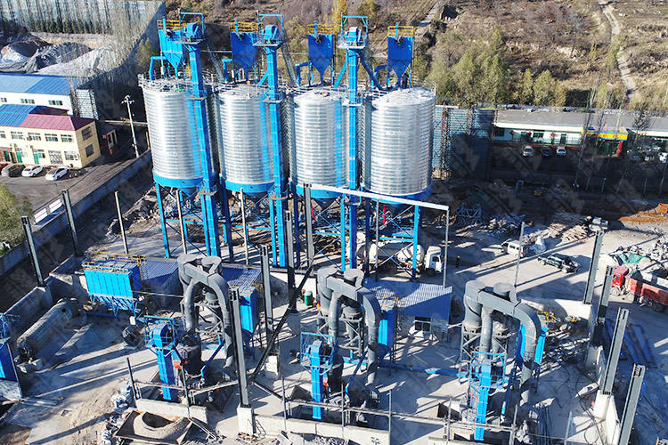 成品礦粉由螺旋輸送機送至斗式提升機,而后進入細長型深倉成品料罐。罐中粉塵氣體經過罐頂除塵器收集后將成品存入成品罐,潔凈氣體排放。